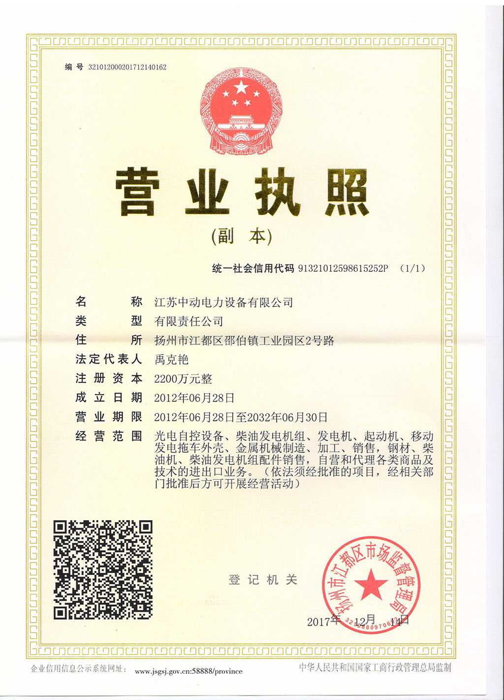 江蘇中動電力設備有限公司營業執照